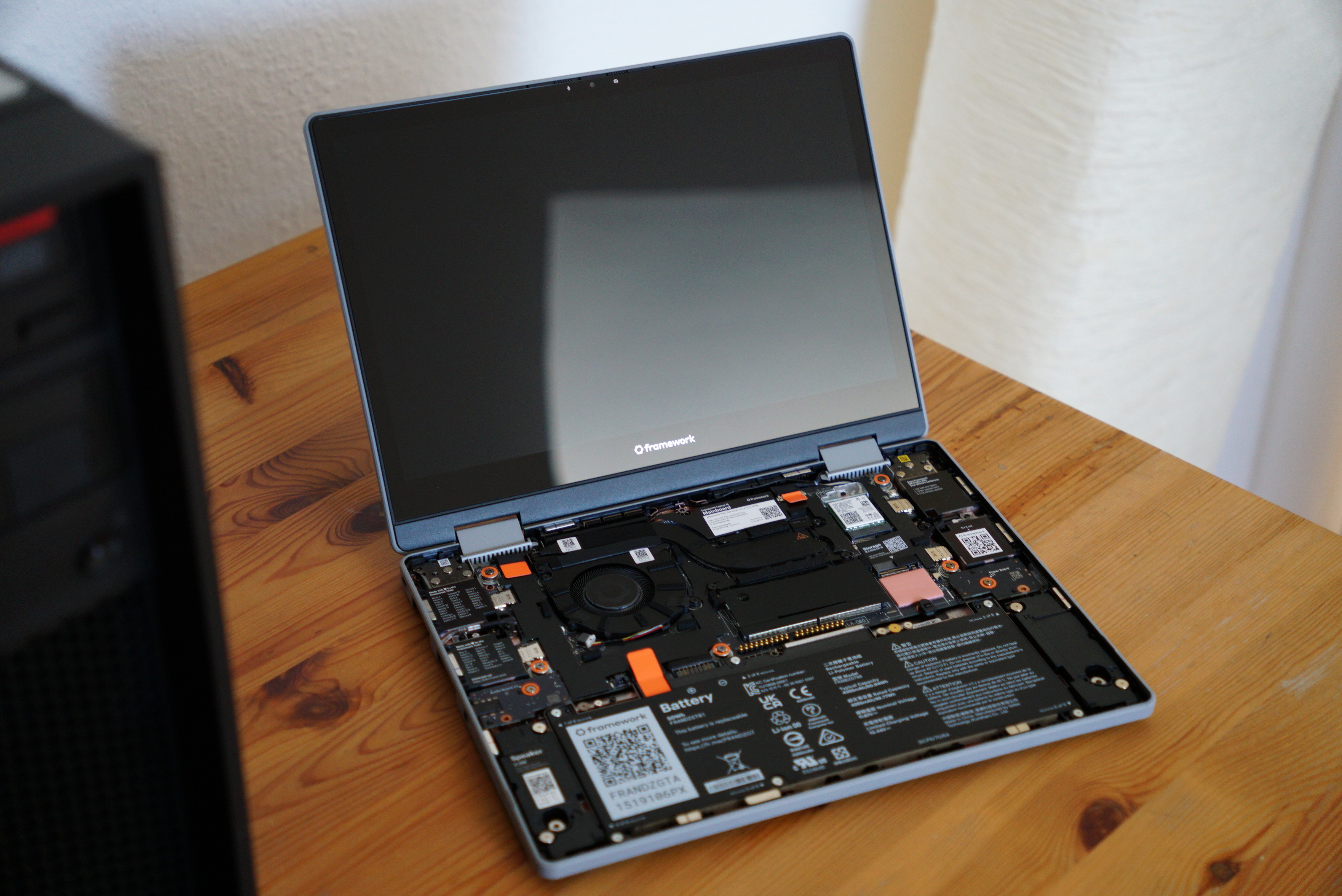 The internals of the machine are honestly quite beautiful in general. Everything is laid out very well and labelled clearly so that you know which component actually does what. There are also very clearly marked orange pull tabs that help you figure out where exactly to pull in order to pull out a certain component. Every component also has a QR code printed onto it that – once scanned – will take you to the page where you can find out how to replace that specific component. The keyboard is attached magnetically and connects to the laptop via pogo pins – this means that there are absolutely no cables you need to remove in order to take out the keyboard (or any cable you need to attach to install it!). This means that the only thing you need to do in order to open up the machine is to (obviously turn it off first) turn it around, unscrew the small handful of screws on the back – which, by the way, are captive screws, which means they do not fall out once unscrewed so that you do not lose them! – and use the non-screwdriver end of the included screwdriver to gently pry the keyboard from the chassis and then just lift it out. The entire process is super painless and takes less than a minute; this makes getting into your machine to actually do something honestly kind of fun!
